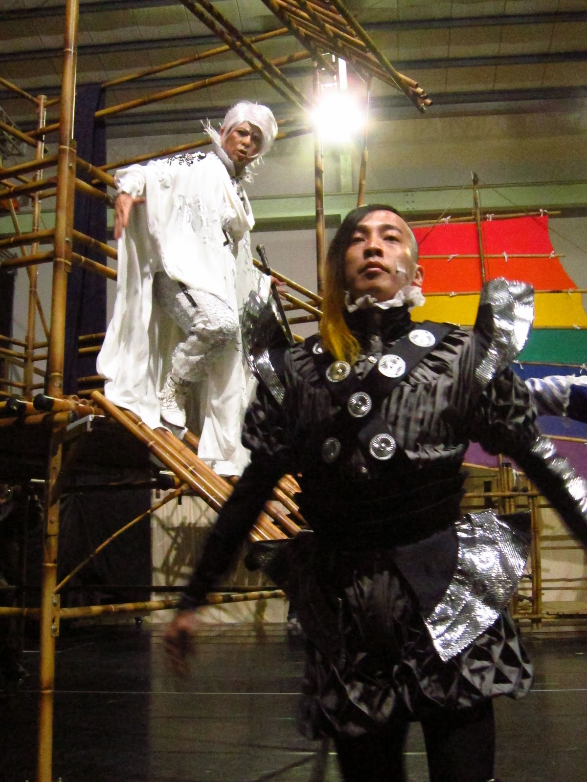 | 奪下今年臺語金曲歌王的荒山亮,除了替《黃金海賊王》寫詞、作曲,也擔任特別演出(飾演海賊王子)。在換上嶄新的髮型及服裝後,荒山亮非常興奮,開心的說,簡直像是黃金版「阿密特」,是「阿密亮」!站在前方的,是由實力派金枝團員李允中所飾演的「巴蒂克」,一頭金髮配上炫麗戲服,非常有型,兩個人站在一起,也成了最帥氣的「黑白郎君」。 |