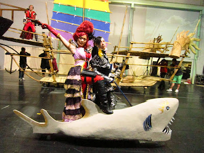 | 除了海賊船外,舞臺上還有會移動的「兇猛鯊魚」! |